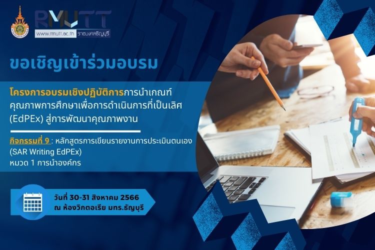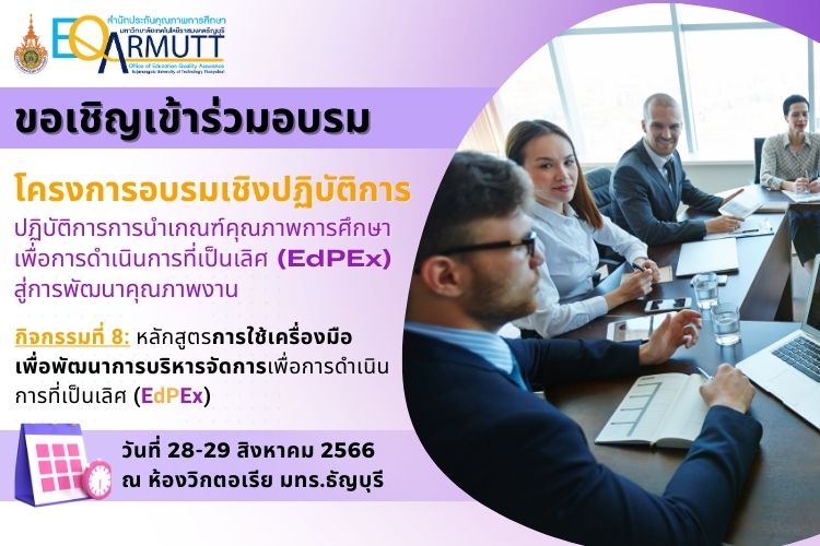 สิงหาคม 31, 2023Published by suphak marujkla on สิงหาคม 31, 2023Categories ข่าวประชาสัมพันธ์โครงการอบรมเชิงปฏิบัติการการนำเกณฑ์คุณภาพการศึกษาเพื่อการดำเนินการที่เป็นเลิศ (EdPEx) สู่การพัฒนาคุณภาพงาน กิจกรรมที่ 8 : หลักสูตรการใช้เครื่องมือเพื่อพัฒนาการบริหารจัดการเพื่อการดำเนินการที่เป็นเลิศ (EdPEx)ขอเชิญผู้บริหาร และบุคลากร… อ่านเพิ่มเติม โครงการอบรมเชิงปฏิบัติการการนำเกณฑ์คุณภาพการศึกษาเพื่อการดำเนินการที่เป็นเลิศ (EdPEx) สู่การพัฒนาคุณภาพงาน กิจกรรมที่ 8 : หลักสูตรการใช้เครื่องมือเพื่อพัฒนาการบริหารจัดการเพื่อการดำเนินการที่เป็นเลิศ (EdPEx)