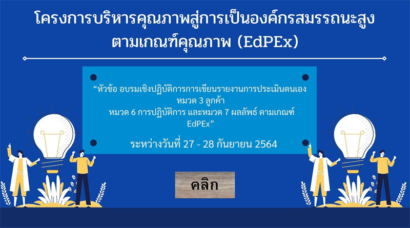 ตุลาคม 5, 2021Published by suphak marujkla on ตุลาคม 5, 2021Categories EdPEx ข่าวประชาสัมพันธ์โครงการอบรมเชิงปฏิบัติการ EdPEx กับการพัฒนากระบวนการทำงานสู่ความเป็นเลิศ<<<<<< เ… อ่านเพิ่มเติม โครงการอบรมเชิงปฏิบัติการ EdPEx กับการพัฒนากระบวนการทำงานสู่ความเป็นเลิศ