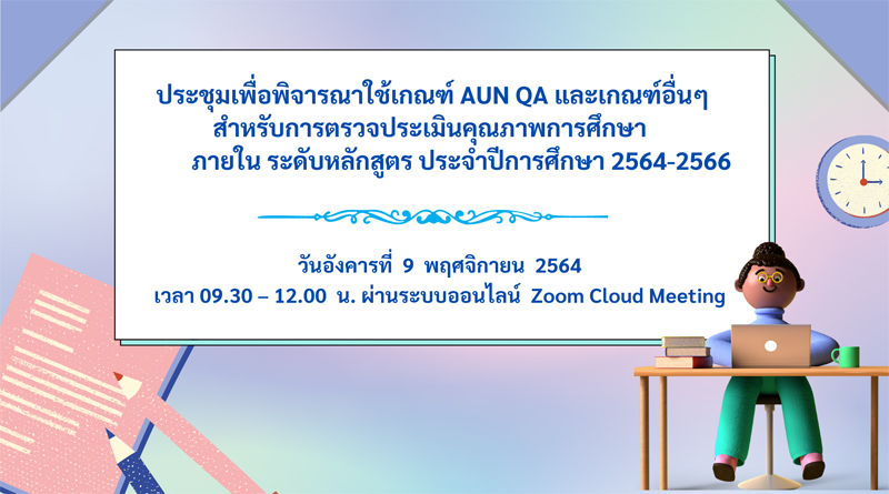 พฤศจิกายน 11, 2021Published by suphak marujkla on พฤศจิกายน 11, 2021Categories ประชุม ภาพกิจกรรมการประชุมเพื่อพิจารณาใช้เกณฑ์ AUN QA และเกณฑ์อื่นๆ สำหรับการตรวจประเมินคุณภาพการศึกษาภายใน ระดับหลักสูตร ปีการศึกษา 2564-2566รศ.ดร.สมหมาย ผิวสะอาด อธิก… อ่านเพิ่มเติม การประชุมเพื่อพิจารณาใช้เกณฑ์ AUN QA และเกณฑ์อื่นๆ สำหรับการตรวจประเมินคุณภาพการศึกษาภายใน ระดับหลักสูตร ปีการศึกษา 2564-2566