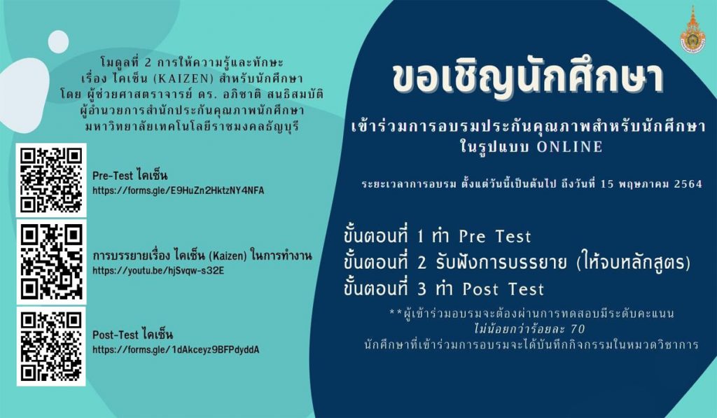 พฤษภาคม 10, 2021Published by suphak marujkla on พฤษภาคม 10, 2021Categories ข่าวประชาสัมพันธ์ขอเชิญนักศึกษาเข้าร่วมการอบรมประกันคุณภาพการศึกษาสำหรับนักศึกษา ในรูปแบบ ONLINEFollowShare
