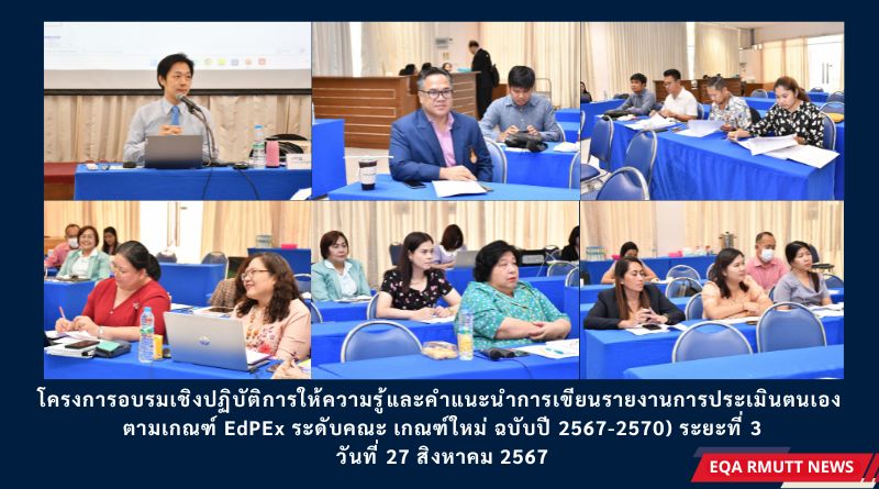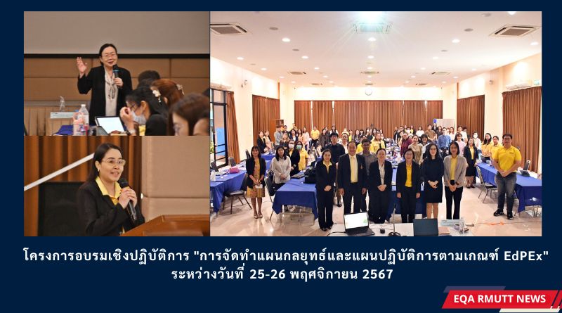 พฤศจิกายน 26, 2024Published by suphak marujkla on พฤศจิกายน 26, 2024Categories EdPEx ภาพกิจกรรมโครงการอบรมเชิงปฏิบัติการ “การจัดทำแผนกลยุทธ์และแผนปฏิบัติการตามเกณฑ์ EdPEx” วันที่ 25 พฤศจิกายน 2567รศ.ดร.สมหมาย ผิวสอาด รักษา… อ่านเพิ่มเติม โครงการอบรมเชิงปฏิบัติการ “การจัดทำแผนกลยุทธ์และแผนปฏิบัติการตามเกณฑ์ EdPEx” วันที่ 25 พฤศจิกายน 2567