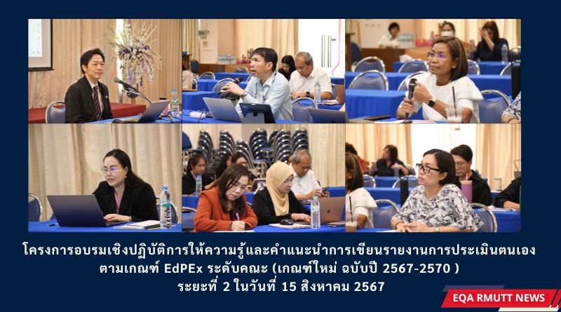 สิงหาคม 16, 2024Published by suphak marujkla on สิงหาคม 16, 2024Categories EdPEx ภาพกิจกรรมโครงการอบรมเชิงปฏิบัติการให้ความรู้และคำแนะนำการเขียนรายงานการประเมินตนเอง ตามเกณฑ์ EdPEx ระดับคณะ (เกณฑ์ใหม่ ฉบับปี 2567-2570 ) ระยะที่ 2 ในวันที่ 15 สิงหาคม 2567สำนักประกันคุณภาพการศึกษา … อ่านเพิ่มเติม โครงการอบรมเชิงปฏิบัติการให้ความรู้และคำแนะนำการเขียนรายงานการประเมินตนเอง ตามเกณฑ์ EdPEx ระดับคณะ (เกณฑ์ใหม่ ฉบับปี 2567-2570 ) ระยะที่ 2 ในวันที่ 15 สิงหาคม 2567
