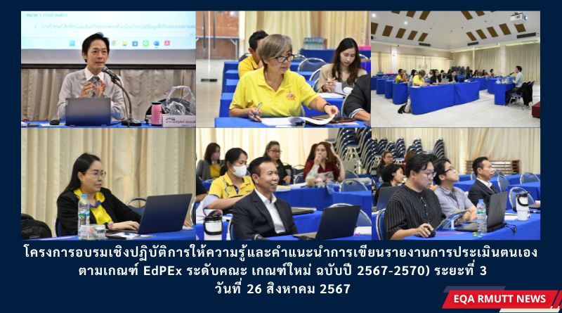 สิงหาคม 27, 2024Published by suphak marujkla on สิงหาคม 27, 2024Categories EdPEx ภาพกิจกรรมโครงการอบรมเชิงปฏิบัติการให้ความรู้และคำแนะนำการเขียนรายงานการประเมินตนเอง ตามเกณฑ์ EdPEx ระดับคณะ เกณฑ์ใหม่ ฉบับปี 2567-2570) ระยะที่ 3 วันที่ 26 สิงหาคม 2567สำนักประกันคุณภาพการศึกษา … อ่านเพิ่มเติม โครงการอบรมเชิงปฏิบัติการให้ความรู้และคำแนะนำการเขียนรายงานการประเมินตนเอง ตามเกณฑ์ EdPEx ระดับคณะ เกณฑ์ใหม่ ฉบับปี 2567-2570) ระยะที่ 3 วันที่ 26 สิงหาคม 2567