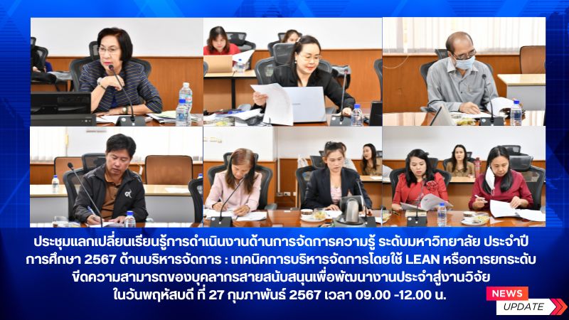 กุมภาพันธ์ 28, 2025Published by suphak marujkla on กุมภาพันธ์ 28, 2025Categories การจัดการความรู้ ประชุม ภาพกิจกรรมประชุมแลกเปลี่ยนเรียนรู้การดำเนินงานด้านการจัดการความรู้ ระดับมหาวิทยาลัย ประจำปีการศึกษา 2567 ด้านบริหารจัดการ : เทคนิคการบริหารจัดการโดยใช้ LEAN หรือการยกระดับขีดความสามารถของบุคลากรสายสนับสนุนเพื่อพัฒนางานประจำสู่งานวิจัย ในวันพฤหัสบดี ที่ 27 กุมภาพันธ์ 2567 เวลา 09.00 -12.00 น.ผศ.ดร.สิริแข พงษ์สวัสดิ์ เ… อ่านเพิ่มเติม ประชุมแลกเปลี่ยนเรียนรู้การดำเนินงานด้านการจัดการความรู้ ระดับมหาวิทยาลัย ประจำปีการศึกษา 2567 ด้านบริหารจัดการ : เทคนิคการบริหารจัดการโดยใช้ LEAN หรือการยกระดับขีดความสามารถของบุคลากรสายสนับสนุนเพื่อพัฒนางานประจำสู่งานวิจัย ในวันพฤหัสบดี ที่ 27 กุมภาพันธ์ 2567 เวลา 09.00 -12.00 น.