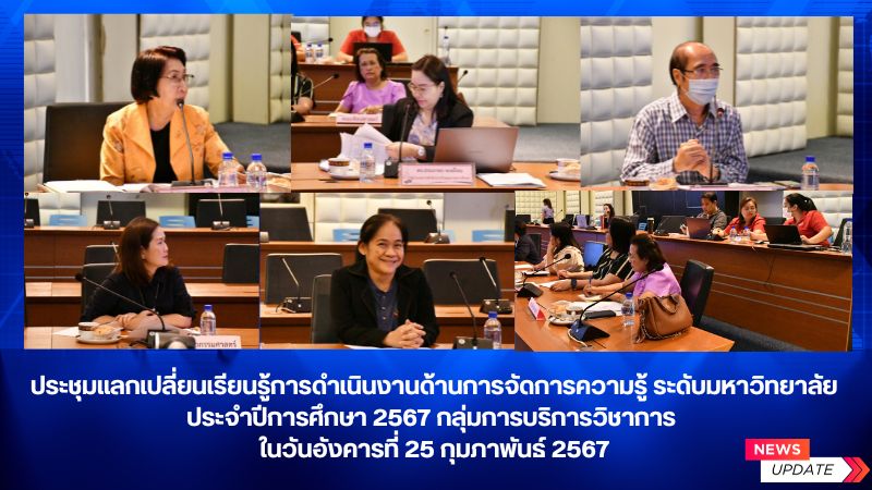 มีนาคม 21, 2025Published by suphak marujkla on มีนาคม 21, 2025Categories การจัดการความรู้ ภาพกิจกรรมประชุมคณะกรรมการแลกเปลี่ยนเรียนรู้ในการจัดการความรู้ ระดับมหาวิทยาลัย ประจำปีการศึกษา 2567 ครั้งที่ 2/2568 (กลุ่มการบริการวิชาการ : เทคนิคการบริการวิชาการเพื่อสร้างรายได้) วันที่ 20 มี.ค.68รศ.ดร.อนินท์ มีมนต์ ผู้ช่ว… อ่านเพิ่มเติม ประชุมคณะกรรมการแลกเปลี่ยนเรียนรู้ในการจัดการความรู้ ระดับมหาวิทยาลัย ประจำปีการศึกษา 2567 ครั้งที่ 2/2568 (กลุ่มการบริการวิชาการ : เทคนิคการบริการวิชาการเพื่อสร้างรายได้) วันที่ 20 มี.ค.68