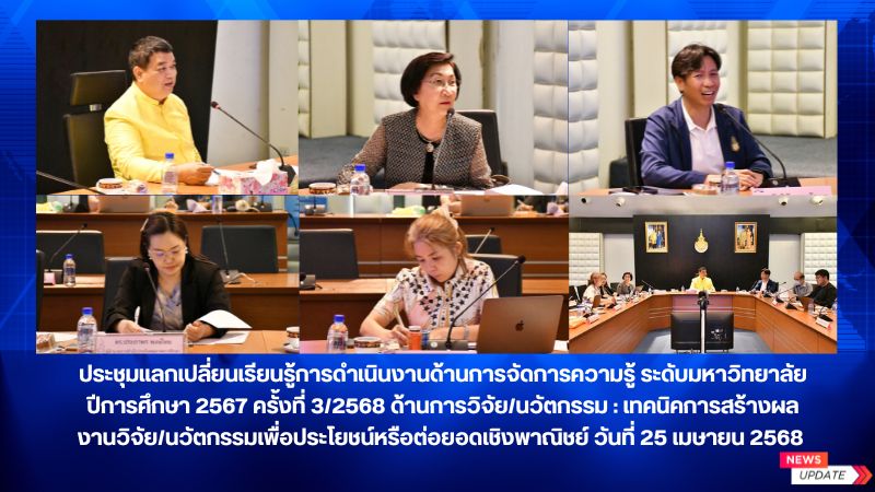 เมษายน 28, 2025Published by suphak marujkla on เมษายน 28, 2025Categories ภาพกิจกรรมประชุมแลกเปลี่ยนเรียนรู้การดำเนินงานด้านการจัดการความรู้ ระดับมหาวิทยาลัย ปีการศึกษา 2567 ครั้งที่ 3/2568 ด้านการวิจัย/นวัตกรรม : เทคนิคการสร้างผลงานวิจัย/นวัตกรรมเพื่อประโยชน์หรือต่อยอดเชิงพาณิชย์ วันที่ 25 เมษายน 2568ศ.ดร.กฤษณ์ชนม์ ภูมิกิตติพิ… อ่านเพิ่มเติม ประชุมแลกเปลี่ยนเรียนรู้การดำเนินงานด้านการจัดการความรู้ ระดับมหาวิทยาลัย ปีการศึกษา 2567 ครั้งที่ 3/2568 ด้านการวิจัย/นวัตกรรม : เทคนิคการสร้างผลงานวิจัย/นวัตกรรมเพื่อประโยชน์หรือต่อยอดเชิงพาณิชย์ วันที่ 25 เมษายน 2568