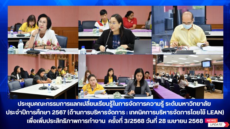 เมษายน 28, 2025Published by suphak marujkla on เมษายน 28, 2025Categories ภาพกิจกรรมประชุมคณะกรรมการแลกเปลี่ยนเรียนรู้ในการจัดการความรู้ ระดับมหาวิทยาลัย ประจำปีการศึกษา 2567 (ด้านการบริหารจัดการ : เทคนิคการบริหารจัดการโดยใช้ LEAN) เพื่อเพิ่มประสิทธิภาพการทำงาน ครั้งที่ 3/2568 วันที่ 28 เมษายน 2568ผศ.ดร.สิริแข พงษ์สวัสดิ์ ท… อ่านเพิ่มเติม ประชุมคณะกรรมการแลกเปลี่ยนเรียนรู้ในการจัดการความรู้ ระดับมหาวิทยาลัย ประจำปีการศึกษา 2567 (ด้านการบริหารจัดการ : เทคนิคการบริหารจัดการโดยใช้ LEAN) เพื่อเพิ่มประสิทธิภาพการทำงาน ครั้งที่ 3/2568 วันที่ 28 เมษายน 2568