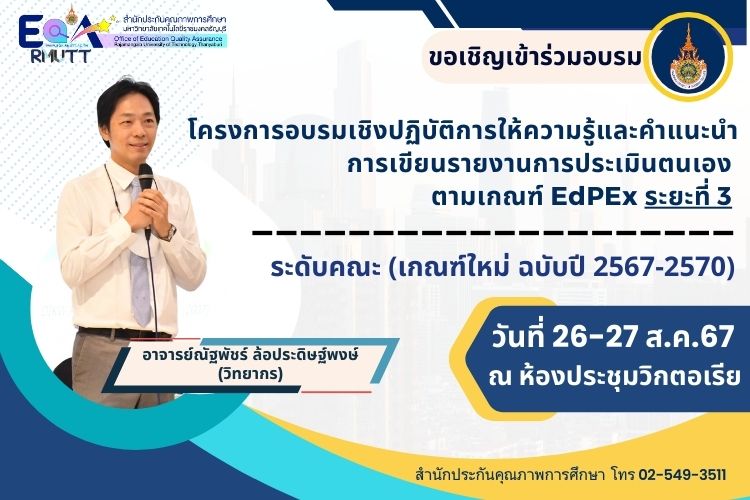 โครงการอบรมเชิงปฏิบัติการให้ความรู้และคำแนะนำการเขียนรายงานการประเมินตนเอง ตามเกณฑ์ EdPEx ระดับคณะ (เกณฑ์ใหม่ ฉบับปี 2567-2570 ) ระยะที่ 2 ในวันที่ 15 สิงหาคม 2567สิงหาคม 16, 2024โครงการอบรมเชิงปฏิบัติการให้ความรู้และคำแนะนำการเขียนรายงานการประเมินตนเอง ตามเกณฑ์ EdPEx ระดับคณะ เกณฑ์ใหม่ ฉบับปี 2567-2570) ระยะที่ 3 วันที่ 26 สิงหาคม 2567สิงหาคม 27, 2024 Published by suphak marujkla on สิงหาคม 16, 2024 Categories ข่าวประชาสัมพันธ์ Tags FollowShare Post Views: 525 Share1 suphak marujkla Related postsสิงหาคม 27, 2025โครงการอบรมเชิงปฏิบัติการ การใช้เครื่องมือ SIPOC ในการบริหารจัดการการดำเนินงานตามเกณฑ์ วันที่ 1-2 กันยายน 2568 ณ ห้องวิกตอเรีย มทร.ธัญบุรีRead moreกรกฎาคม 13, 2025โครงการ RMUTT Show and Share การจัดการความรู้ ระหว่างวันที่ 15-17 กรกฎาคม 2568Read moreพฤษภาคม 15, 2025โครงการอบรมพัฒนาผู้ประเมินคุณภาพการศึกษาภายในระดับหลักสูตร ตามเกณฑ์ AUN-QA (RMUTT AUN-QA Assessor รุ่นที่ 3) หัวข้อ KM : Misconception of OBE วันที่ 26 พฤษภาคม 2568Read more Comments are closed.