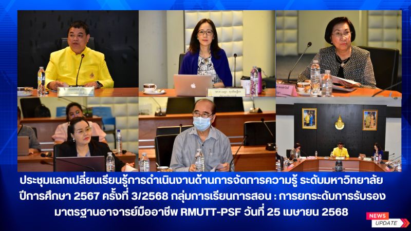 เมษายน 28, 2025ศ.ดร.กฤษณ์ชนม์ ภูมิกิตติพิชญ์ รองอธิการบดีมหาวิทยาลัยเทคโนโลยีราชมงคลธัญบุรี เป็นประธาน ในการประชุมแลกเปลี่ยนเรียนรู้การดำเนินงานด้านการจัดการความรู้ ระดับมหาวิทยาลัย ปีการศึกษา 2567 ครั้งที่ 3/2568 กลุ่มการเรียนการสอน : การยกระดับการรับรองมาตรฐานอาจารย์มืออาชีพ RMUTT-PSF วันที่ 25 เมษายน 2568 ณ ห้องประชุมมังคลอุบล มทร.ธัญบุรี