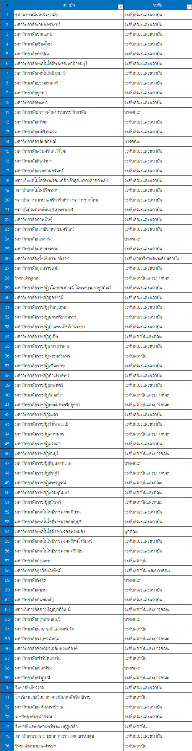 สำหรับการประกันคุณภาพการศึกษาภายใน และได้แจ้งมายังสป.อว. แล้ว จำนวน 76 สถาบัน ได้แก่