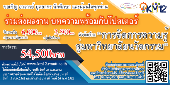 ธันวาคม 17, 2018Published by Mookkarin on ธันวาคม 17, 2018Categories ข่าวประชาสัมพันธ์ขอเชิญร่วมส่งผลงานประกวดแนวปฏิบัติที่ดีในหัวข้อ “การจัดการความรู้สู่มหาวิทยาลัยนวัตกรรม”ขอเชิญ อาจารย์ บุคลากร นัก… อ่านเพิ่มเติม ขอเชิญร่วมส่งผลงานประกวดแนวปฏิบัติที่ดีในหัวข้อ “การจัดการความรู้สู่มหาวิทยาลัยนวัตกรรม”